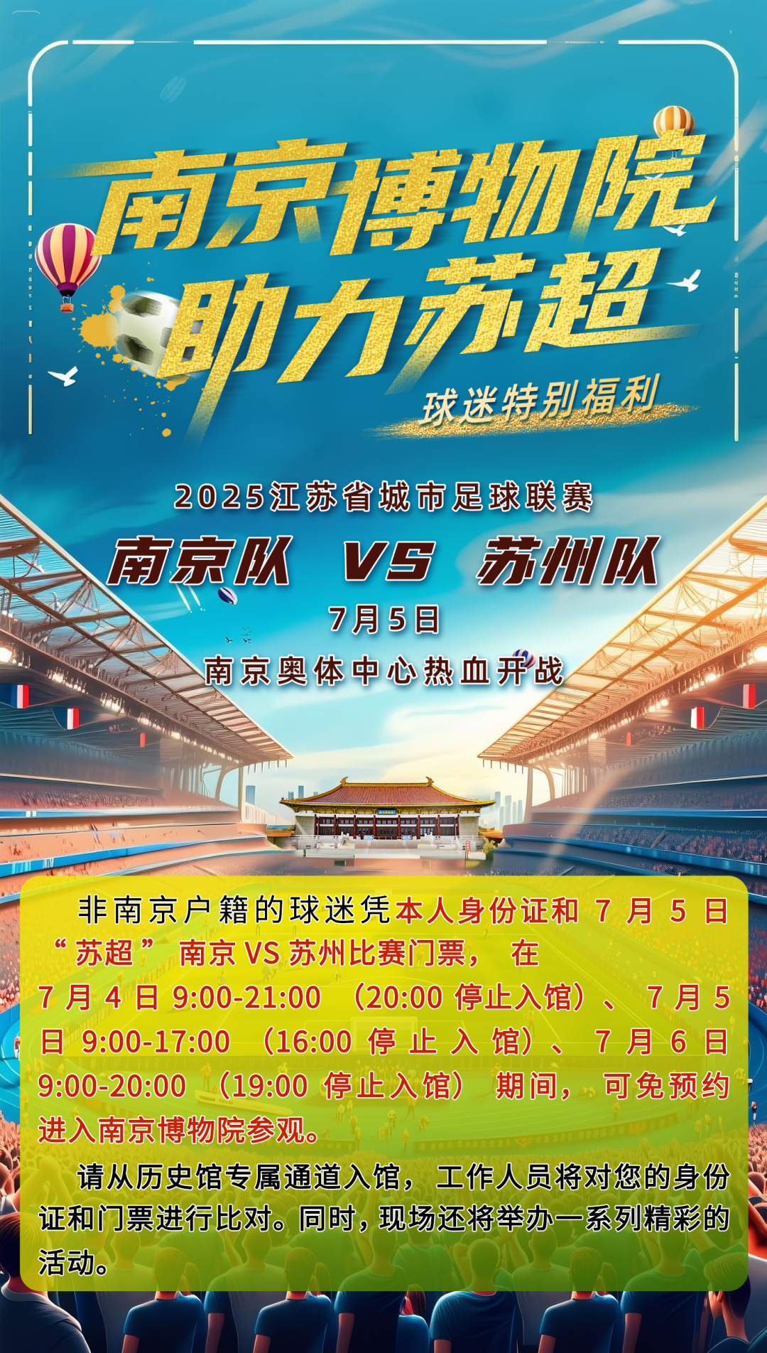 非南京户籍的球迷凭本人身份证和7月5日“苏超”南京VS苏州比赛门票,在7月4日-7月5日9:00-21:00(20:00停止入馆)、7月5日9:00-17:00(16:00停止入馆)、7月6日9:00-20:00(19:00停止入馆)期间,可免预约进入南京博物院参观。请从历史馆专属通道入馆,工作人员将对您的身份证和门票进行比对。同时,现场还将举办一系列精彩的活动。