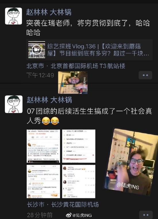 陆虎感谢《欢迎来到蘑菇屋》制片人赵林林,表示自己通过大林哥的定位看出来赵林林如今真的在帮忙0713再就业男团努力谈节目。