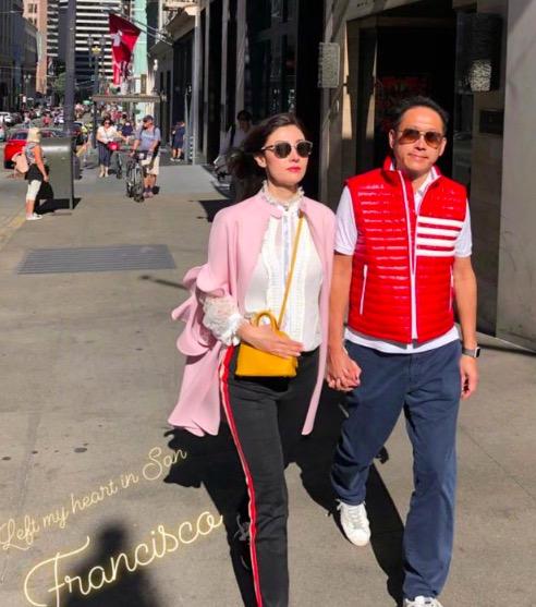图片中,李嘉欣和老公在旧金山街头双手紧牵阔步前行,夫妻二人运动装扮,满面春风,李嘉欣戴墨镜,长发飘飘,依然满满的港姐范儿。粉色雪纺质感的衣衫仙气十足。许晋亨则穿一件红色条纹马甲,运动裤运动鞋傍身,潮范十足。网友纷纷表示:李嘉欣48岁依然那么美,那么年轻。船王儿子也越来越潮了。